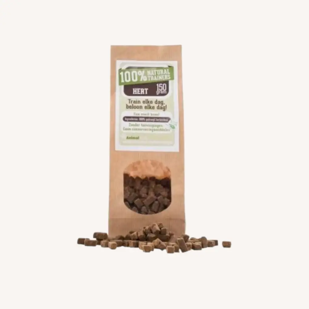 100% Hert trainers (150 gram) zijn smakelijke, natuurlijke beloningssnacks die gemaakt zijn van hertenvlees. Dankzij hun handige formaat zijn deze hondensnacks ideaal om te gebruiken tijdens trainingen of gewoon als lekker tussendoortje. De volle smaak van hert maakt ze bijzonder aantrekkelijk, zelfs voor kieskeurige eters.